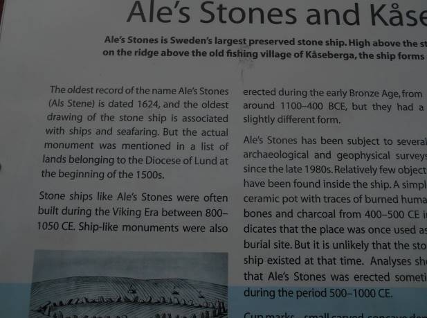 Na prilazu ovoj lokaciji smještena su dva pisana objašnjenja o svrsi Ales Stenara. Prvo je ono iz arheoloških krugova. Tu su svašta “udrobili”, namjerno zamagljujući činjenicu da ne znaju o čemu je riječ. Pominju Vikinge iz 800-1050 godine nove ere, koji su, prema njihovim tvrdnjama, često pravili kamene građevine u obliku brodova. Stoga su ovu lokaciju nazvali ovalnim kamenim brodom. Tu je i Željezno doba, zatim pominju i Bronzano doba, tri hiljade godina unatrag, kada su, kako tvrde, pravljene megalitne građevine “slične brodovima” na drugim lokacijama. Pišu i o radiokarbonskim datiranjima uzoraka uglja i drveta koja idu unatrag do hiljadu ipo godina.