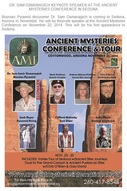 Pronalazač bosanskih piramida dr. Semir Osmanagić bio je vodeći predavač na međunarodnoj konferenciji pod nazivom “Misterije drevne prošlosti” (“Ancient History Mysteries”), koja je održana 22. novembra 2014. u američkoj saveznoj državi Arizona, u gradu Cottonwood, u blizini čuvene Sedone.