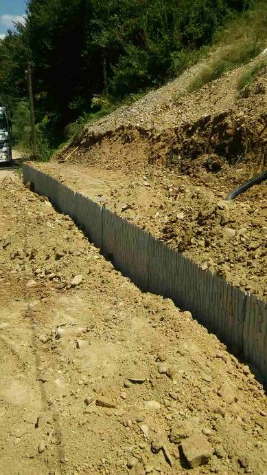 Iskopani su temelji dubine 60 cm, zatim su betonirani armiranim betonom. Na njih je postavljen prvi red betonskih gabiona koji su ispunjeni šljunovitim materijalom i kamenom. Na ovaj prvi red postavljen je drugi, pomjeren pola metra u dubinu. Ukupno četiri reda gabiona će predstavljati potporu nasipu i trajno rješenje za ovu lokaciju.