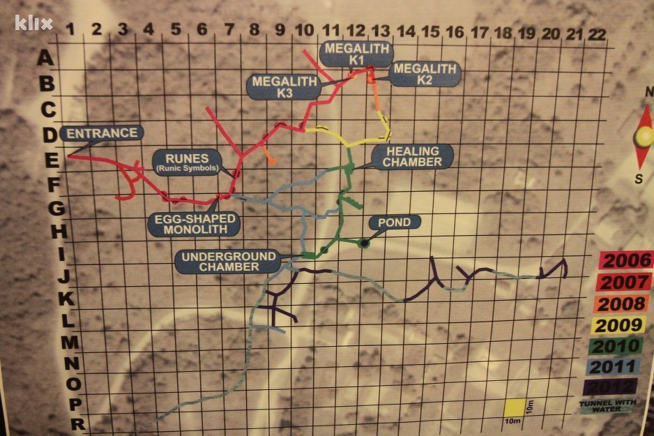 “Tu se nalazi mreža tunela i komora na dubini od 25 metara ispod zemlje. U smjeru jug, jugo-zapada vode prema piramidi Sunca. U njemu se nalazi bistro jezero kao i pijača voda koja je bistra, netaknuta i zdrava za piće. Inženjeri koji su došli nakon onih koji su izgradili ove tunele, su nanijeli materijale i zakopali ih kako bi sačuvali ovu tajnu”, kaže Osmanagić.