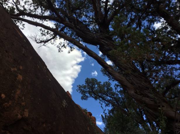 Penjemo se na crveno kameno uzvišenje s lijeve strane. Usput nekoliko stabala smreke. Po deblima su izrazite linije na kori koje se spiralno savijaju. Ako se obrati pažnja, vidi se da su zapravo sve grane na smreki čudno uvijene.