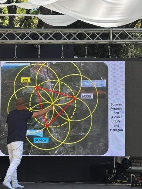 Doktor Osmanagić je održao dvočasovno predavanje u četvrtak 18. septembra 2025. na kome je govorio o otkriću bosanskih piramida, elementima sakralne geometrije koji su primjenjeni u rasporedu objekata u Bosanskoj dolini pirmaida, zatim novom otkriću Fibonačijeve veze između bosanskih piramida i rasporeda zvijezda Plejada, o ljekovitim aspektima energije piramida ali i konceptu drugačije budućnosti umjesto one koju promoviraju kao ‘nove zapadne vrijednosti’.