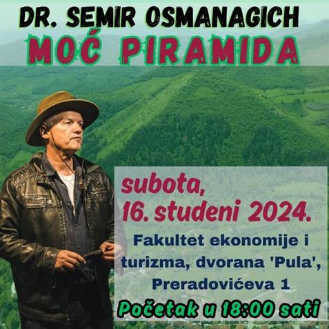 U Puli će direktor Fondacije ‘Arheološki park: Bosanska piramida Sunca’ govoriti o piramidama i njihovoj stvarnoj svrsi. Prezentacija će biti održana na Fakultetu ekonomije i turizma Sveučilišta u Puli. Datum je subota, 16. studeni 2024. s početkom u 18:00 sati.
