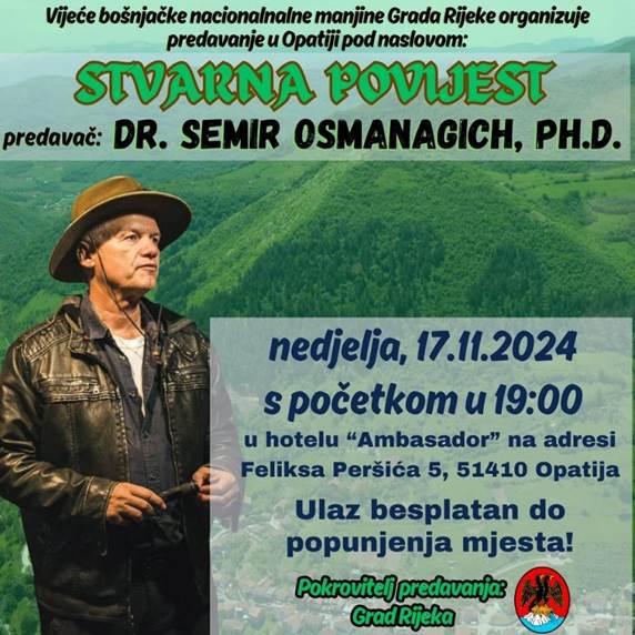 U Opatiju Dr Osmanagić dolazi slijedeći dan, u nedjelju 17. studenog i u kongresnoj dvorani hotela ‘Ambasador’ prisutni će imati priliku da čuju stvarnu povijest čovječanstva i naših prostora. Početak je u 19:00 sati.