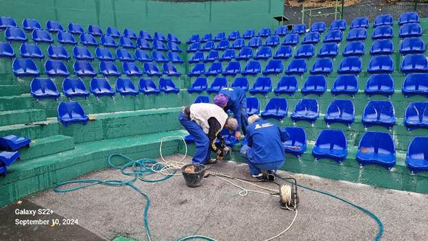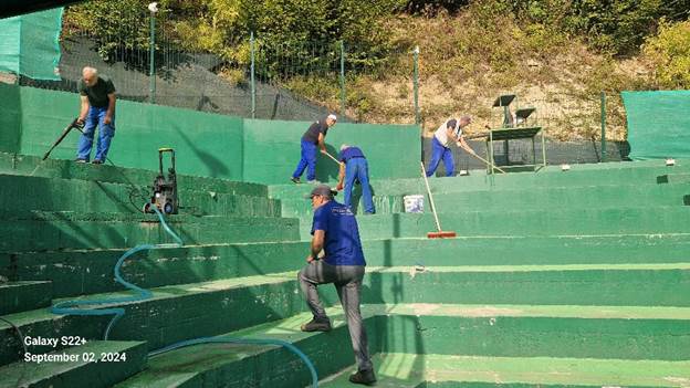 Plastične stolice nabavljene su u regionu i montirane tokom septembra. Prethodno je skinuta stara farba s tribina i one su premazane novom zelenom bojom. Na zapadnu tribinu glavnog stadiona postavljene su zelene stolice. Njihov ukupan broj je 650, što sa južnom tribinom i 200 stolica i istočnom tribinom sa klupama za 1.000 posjetilaca daje gotovo 2.000 sjedišta za gledaoce.