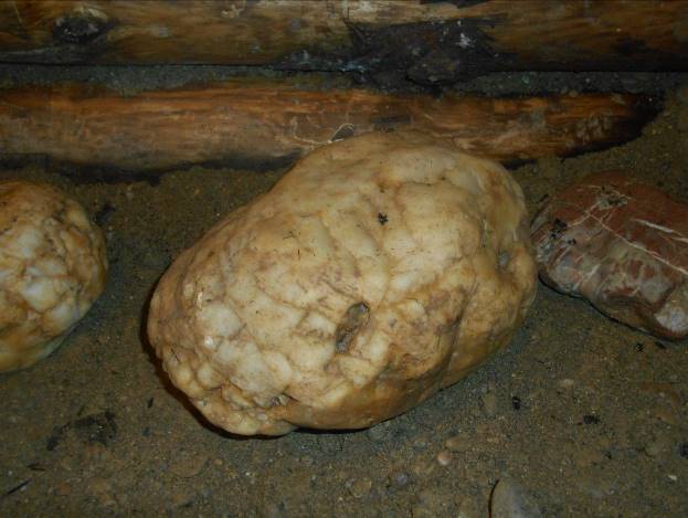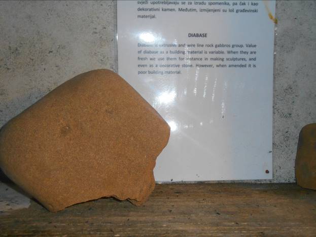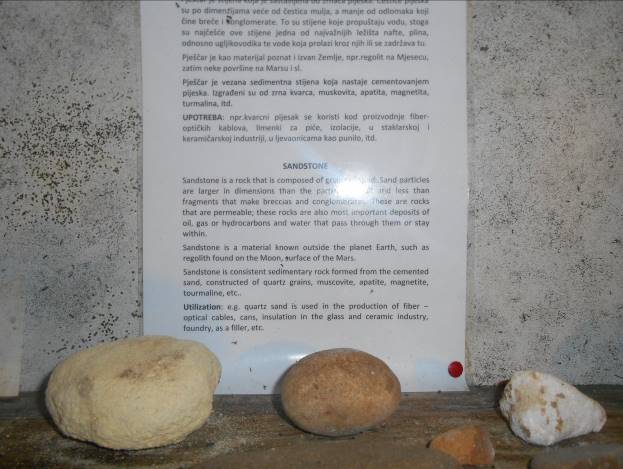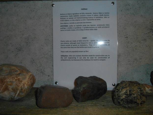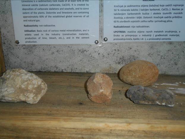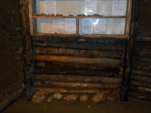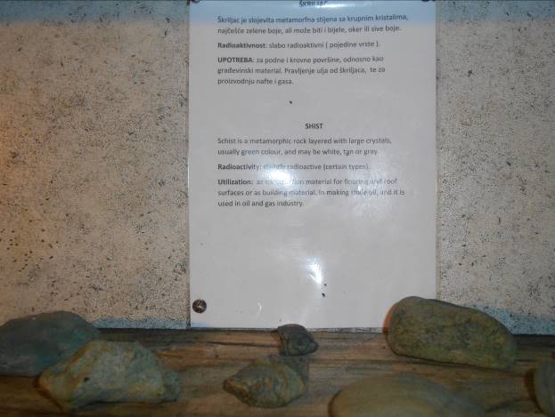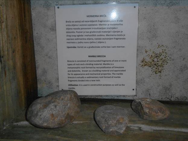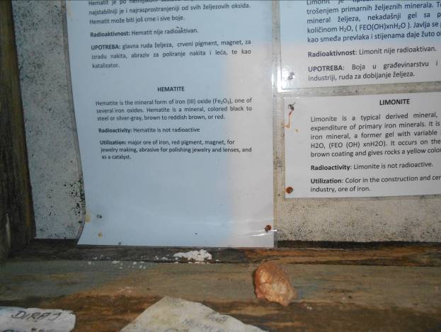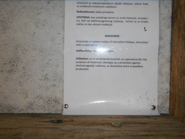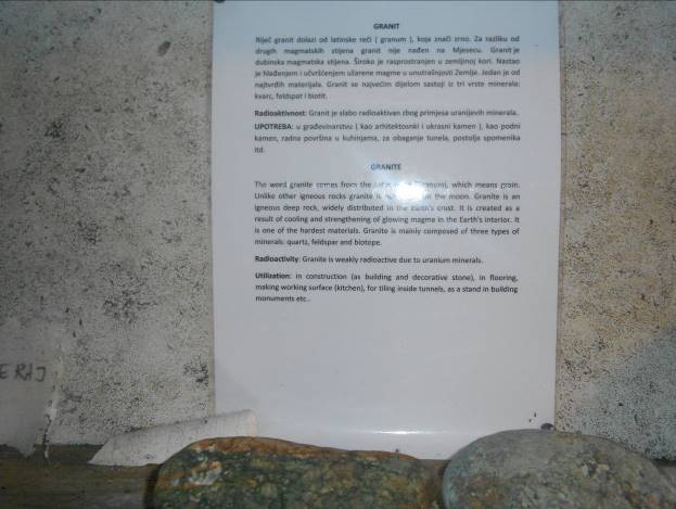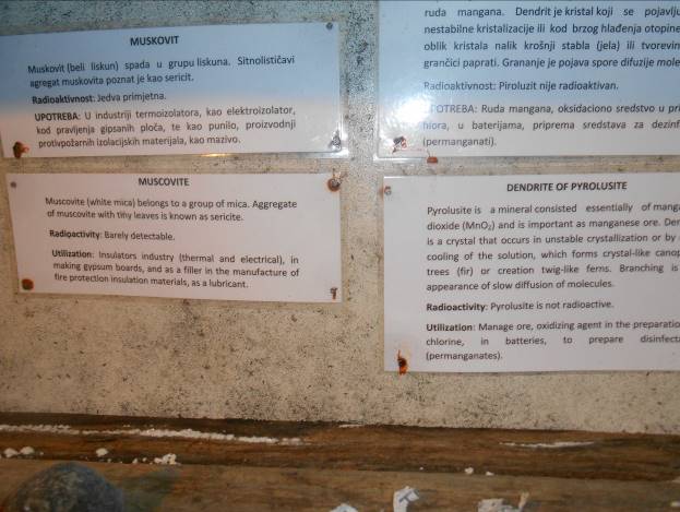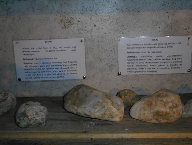 Među eksponatima su različiti minerali koji su pronađeni unutar tunela kao što su: muskovit, dendrit, amazonit, hematit, limonit, pješčar, kvarc, mermerna breča, rožnac i drugi. Daje se dvojezični opis materijala, radioaktivnost, upotreba i energetske karakteristike.