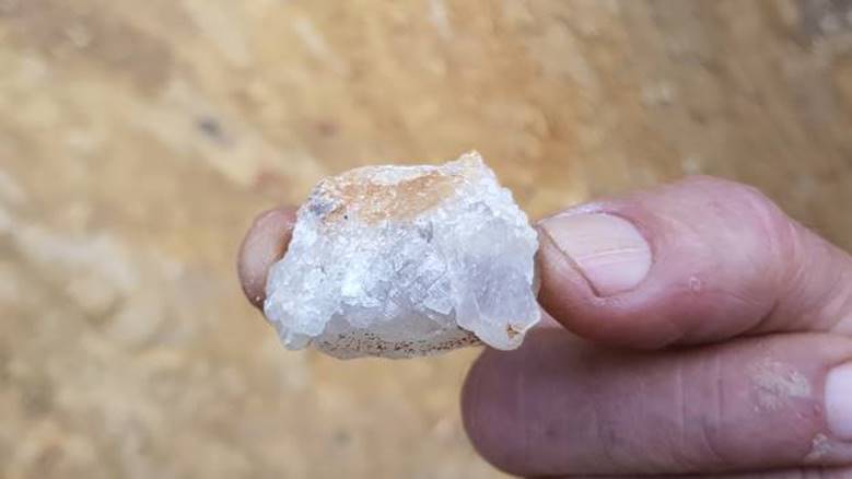By mid-August 2018 we find crystals in blocks but at the nearby property. During the excavation tour I joined the Foundation geologist from England Richard Hoyle. I showed him crystal and he said: