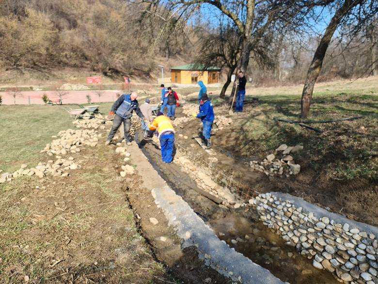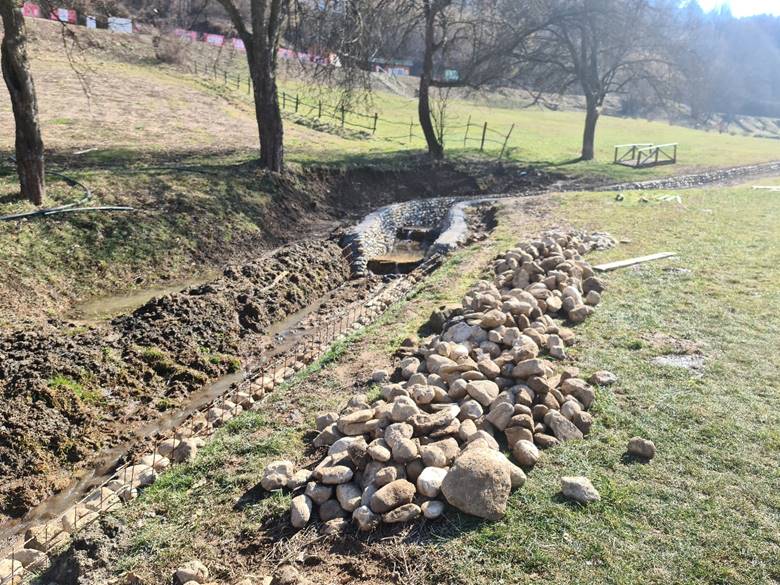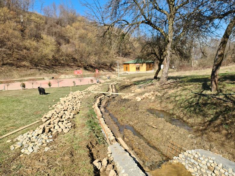 Nekoliko lijepih sunčanih dana krajem februara 2022. iskorišteno je za nastavak izgradnje obaloutvrde u postojećom potoku, inače pritoci rijeke Bosne. Pripremljeno je korito potoka radom bagera i ručno, postavljene su armaturne mreže i beton te ugrađeni kameni obluci iz tunela Ravne i Ravne 3. Ukupna dužina postavljene obaloutvrde je 42 metra.