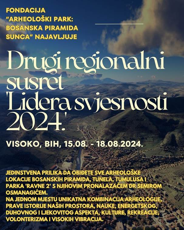 Ekskluzivna prilika da obiđete sve arheološke lokacije bosanskih piramida, tunela, tumulusa i parka ‘Ravne 2’ s njihovim pronalazačem Dr Semirom Osmanagićem. Na jednom mjestu unikatna kombinacija arheologije, prave istorije naših prostora, nauke, energetskog, duhovnog i ljekovitog aspekta, kulture, rekreacije, volonterizma i visokih vibracija.