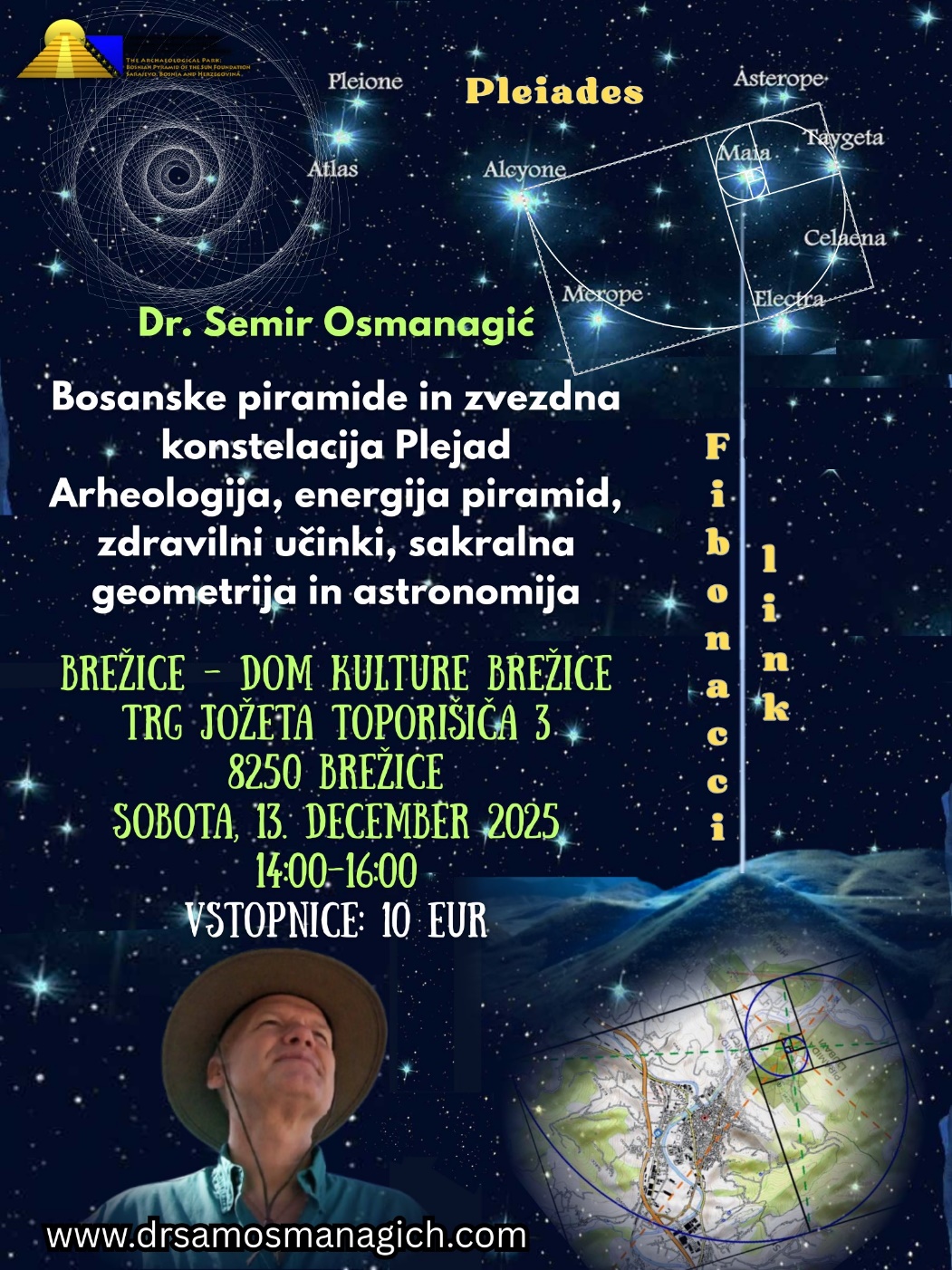 Javnost u Hrvatskoj i Sloveniji imaće priliku da sazna više o posljednjem fantastičnom arheoastronomskom otkriću i vezi između bosanskih piramida i zvjezdane konstelacije Plejada, ali i o rasporedu bosanskih piramida koji prati elemente sakralne geometrije, te energetskoj, komunikacijskoj i ljekovitoj svrsi piramida.