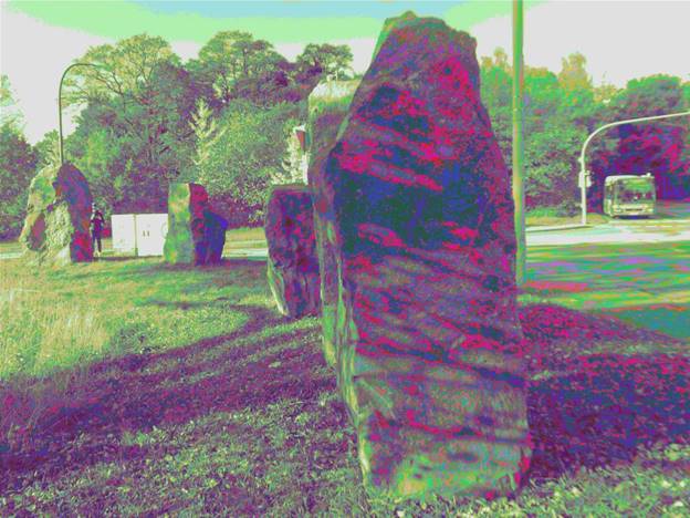 Dijagonalno od njega, na drugoj strani raskrsnice je pet sačuvanih megalita. Jos uvijek su na svojim originalnim mjestima. Svi su oštećeni. Nekada su bili pravougaoni, s oblikovanim ravnim površinama. Mjerenjem sam ustanovio da danas imaju masu od 4-12 tona. Postavljeni su kružno, na zamišljenoj kružnici. Ako su nekada tvorili megalitni krug, bio je velikih razmjera. Sabina pod travom otkriva tragove šestog megalita poravnanog s površinom.