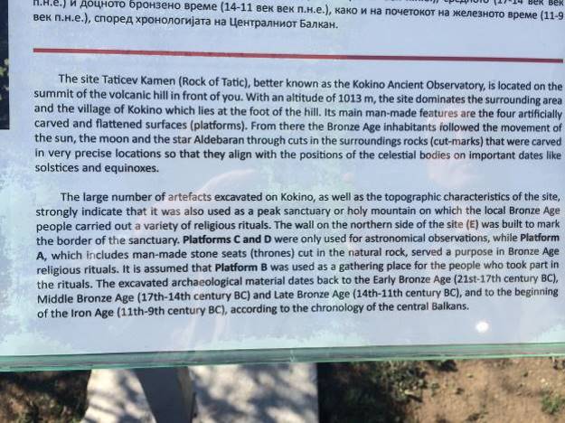 “Kokino je staro 4.250 godina. Vidljivo je sa udaljine od 50 km. Bilo je u upotrebi 1.500 godina kao svetilište. Prestaje biti svetilište 800 g. p.n.e. Vidljiva je razlika u keramici. Podižu se naselja preblizu Kokinu, što znači da je izgubilo status svetog mjesta. Kokino je nepristupačan sa istoka i zapada, ulaz je sa juga i sa sjevera.