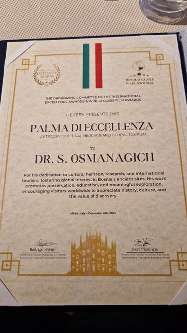 ‘Organizacijski komitet ‘International Excellence Awards’ i ‘World Class Film Awards’ dodjeljuju ‘Palma di Eccellenza’ nagradu u oblasti kulturnog nasljeđa i globalnog turizma Dr S. Osmanagiću za njegovu posvećenost kulturnom nasljeđu, istraživanju i međunarodnom turizmu, promovirajući globalni interes za drevne lokacije Bosne i Hercegovine. Njegov rad je fokusiran na zaštitu kulturnog nasljeđa, obrazovanje i svrsishodno istraživanje, ohrabrujući posjetioce iz čitavog svijeta da poštuju historiju, kulturu i vrijednosti otkrića. Milano, Italija, 6. decembar 2025.’