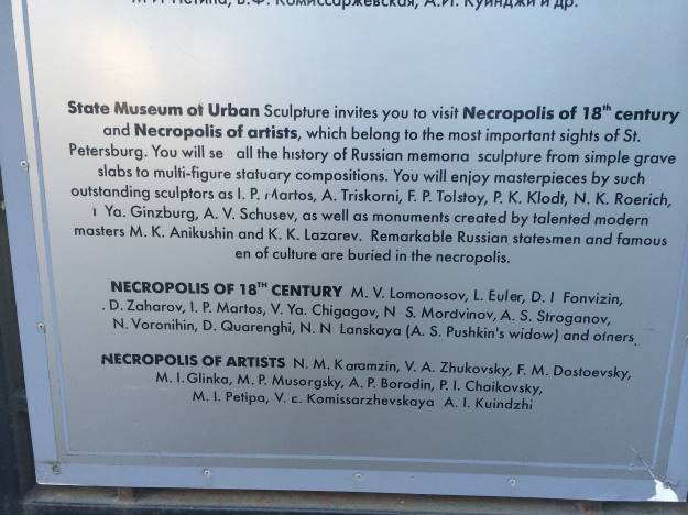 U Gradskom muzeju skulptura u St. Peterburgu posjećujem miran i dostojanstven park s grobnicama vodećih ruskih umjetnika XVIII, XIX i XX stoljeća. Dostojevski, Musorgski, Borodin, Rimsky-Korsakov…
