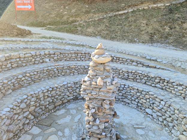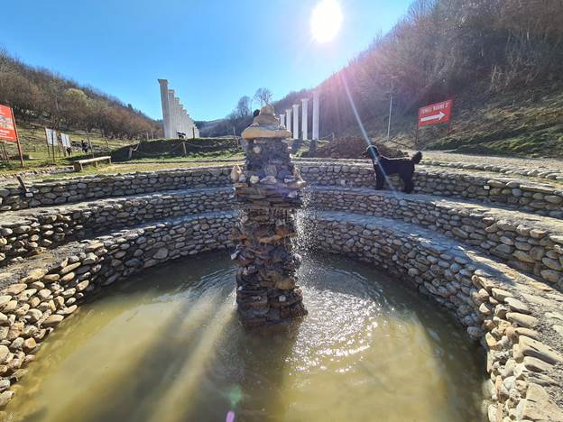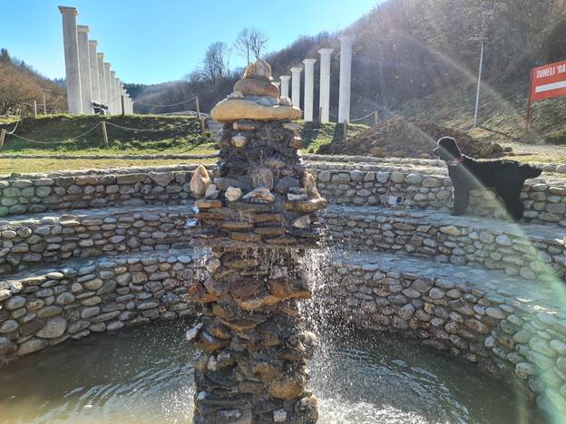 Interesantni spiralni dizajn s energetskim kamenim oblucima iz tunela Ravne privlači pažnju posjetilaca. U toku je probno punjenje fontane. Koristi se voda iz izvora iz energetskog uzvišenja ‘Zvonik’.