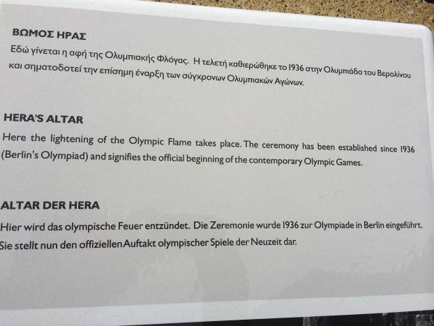 Svečanost olimpijskog plamena datira od olimpijskih igara u Berlinu 1936. Hitler je tražio Zeusov oltar, kojega nije uspio naći. Zato je iskoristio Herin oltar, odakle je uz pomoć ogledala zapaljen plamen koji je donesen u Berlin. Ova tradicija olimpijskih baklji se zadržala evo već 80 godina.