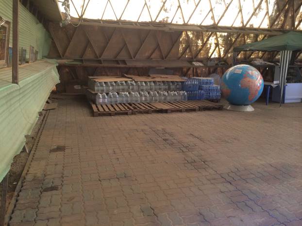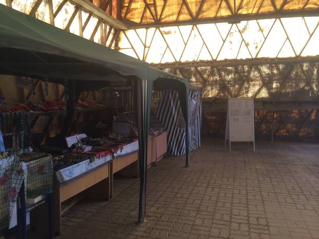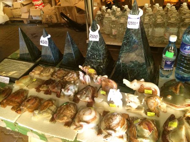 S lijeve strane nekoliko stolova sa suvenirima. Na njima male orgonske piramide, suveniri iz Kine, plastične flase s vodom, nakit od kamenja, knjige te različito poludrago kamenje na ogrlicama i narukvicama. Prodavci čekaju turiste. Dvostrani flajer samo na ruskom jeziku. Na zidu mala reklama za snimanje aure u vanjskoj kućici. Na podu palete s flašama s vodom.