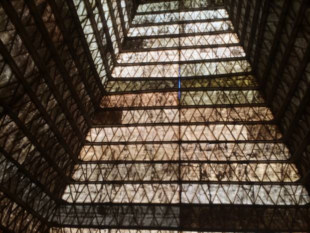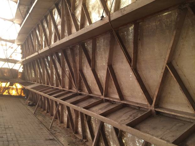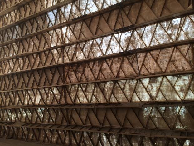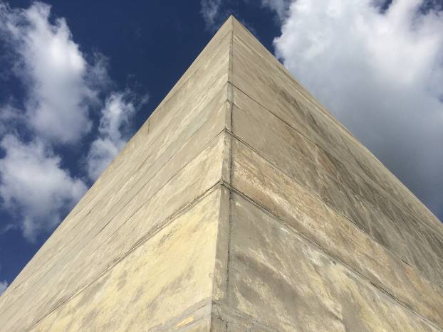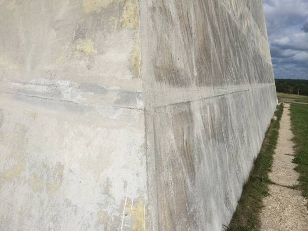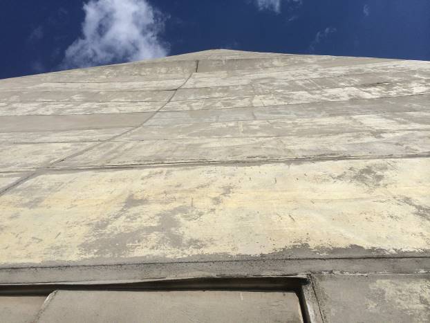 Dodirujem vanjske zidove. Fiberglas. Čvrst, ali ulegnut na nekoliko sekcija. Vjerovatno od naleta vjetra, kiše, snijega. Masa piramide je 55 tona. Uglovi su pružaju u ravnoj liniji sve do vrha. Sva četiri ugla su dobro očuvana.