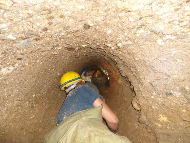 Nakon još dvije raskrsnice došli smo do nove barijere. Južni smjer tunela je bio zatrpan do samog vrha. To nije obeshrabrilo mladog italijanskog arheologa koji je počeo rukama da čisti šljunak i riječne oblutke. Nakon četrdesetak minuta stvorio je dovoljno slobodnog prostora da se provuče između tavanice i nabacanog šljunka. Ubrzo smo i mi ostali ušli za njim. Smjenjivale su se sekcije s vodom sa onim suhim, bez vode.