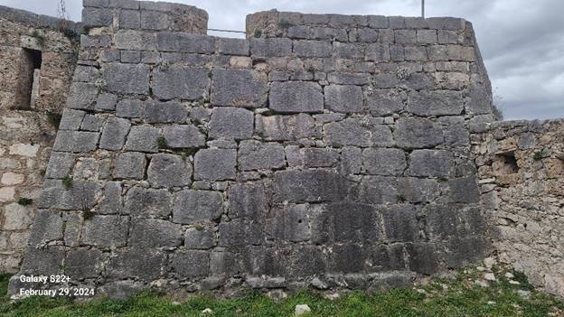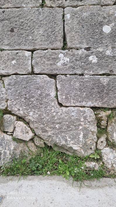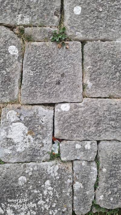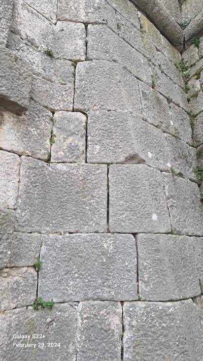 Vidljivo je nekoliko polligonanih blokova. Najveći i najupečatljiviji je onaj u osnovi kapije, koji ima čak 18 stranica. Masa mu je više od jedne tone i sjajan je primjer megalitne gradnje. U zidu se nalazi još nekoliko poligonalnih blokova, s više od uobičajenih šest stranica i osam uglova.