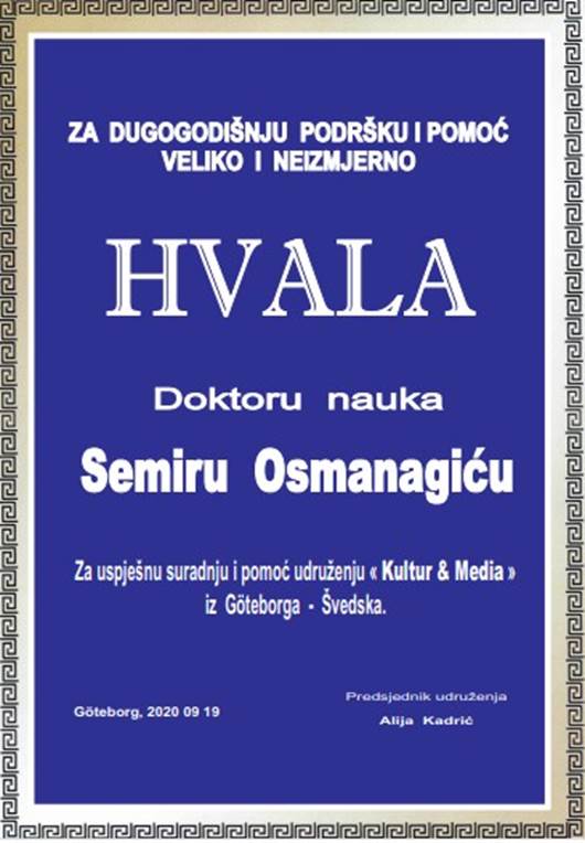 Pored praćenja vijesti iz Visokog Udruženje „Kultur & Media“ je ovih dana dr. Semiru Osmanagiću poslalo i zahvalnicu u kojoj stoji: „Za dugogodišnju podršku i pomoć veliko i neizmjerno HVALA Doktoru nauka Semiru Osmanagiću za uspješnu saradnju i pomoć Udruženju „Kultur & Media“ Geteborg – Švedska“.