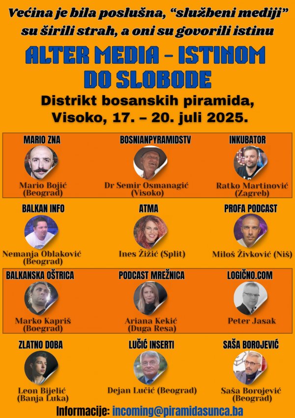 Po prvi put u regiji okupljaju se nezavisni novinari koji vode utjecajne youtube kanale u Srbiji, Hrvatskoj, Bosnia i Hercegovini i Sloveniji. Ovaj skup, pod nazivom ‘Alter Media – istinom do slobode’, bit će održan u Predavaoni parka ‘Ravne 2’ u Distriktu bosanskih piramida.