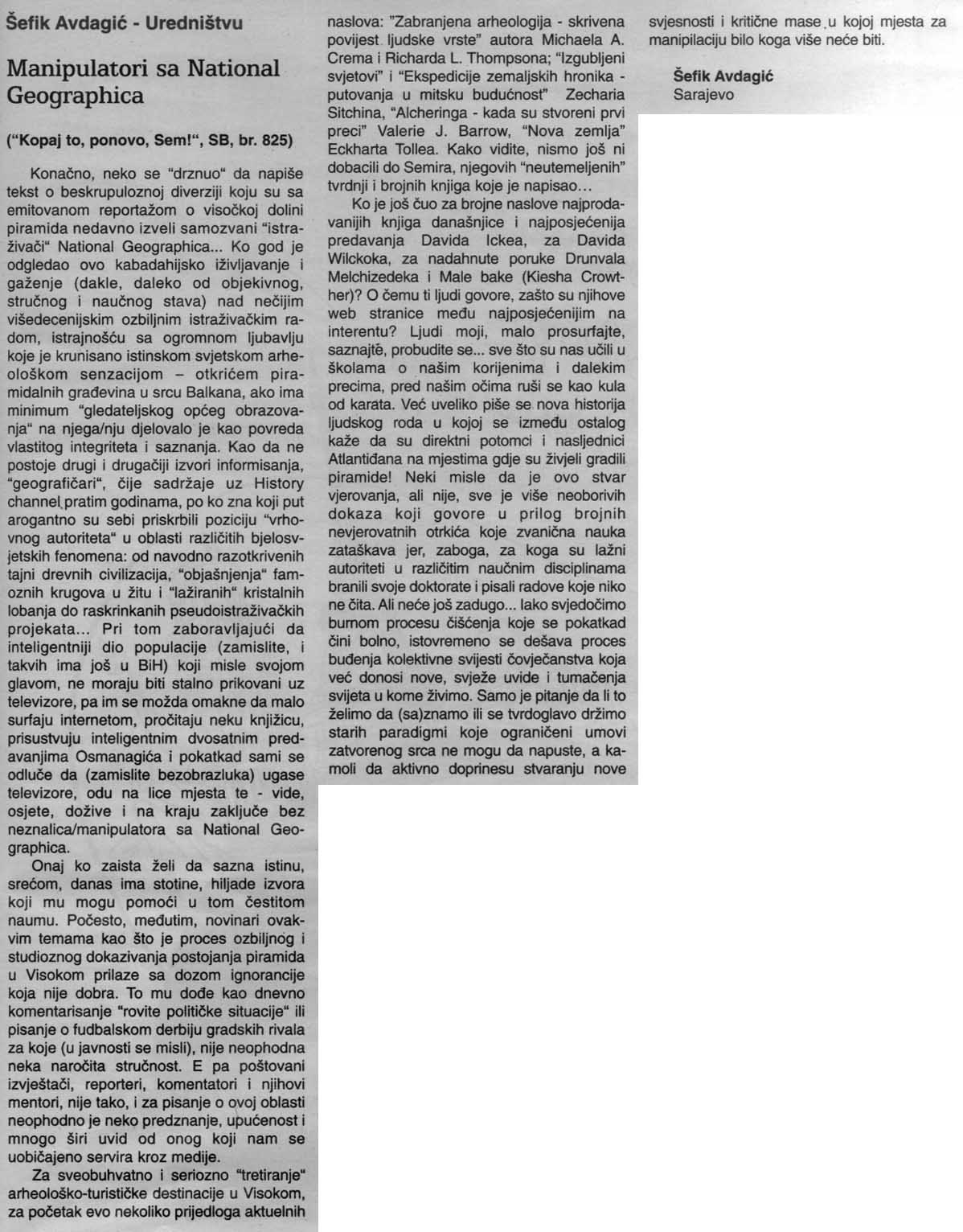 Konačno, neko se „drznuo“ da napiše tekst o beskrupuloznoj diverziji koju su sa emitovanom reportažom o visočkoj dolini piramida nedavno izveli samozvani „istraživači“ National Geographica…