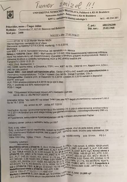 Naime, Julius je bolovao od raka pluća, o čemu svjedoče i nalazi Univerzitetske bolnice u Bratislavi, odjel onkologije, a pored toga, zbog širenja bolesti, imao je i brojne druge zdravstvene probleme, povezane sa teškom bolešću. Na nalazima iz mjeseca februara ove godine, zabilježen je rak pluća, a najnoviji nalazi koje je uradio i donio sa sobom, od 27.maja ove godine, kažu da je rak nestao!