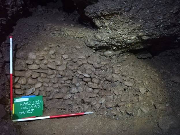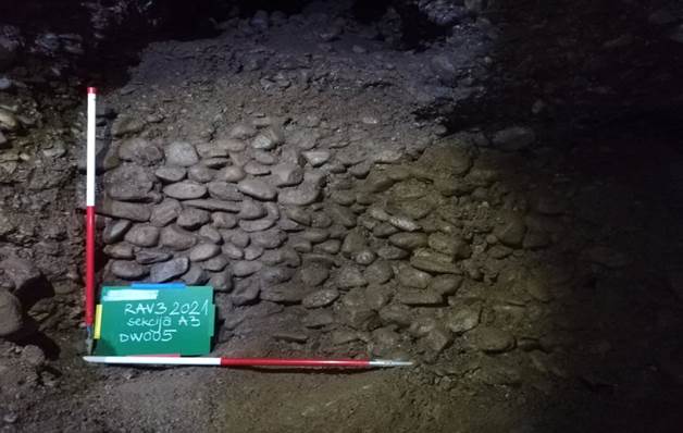 Riječni oblutak slagan je u nekoliko redova, u ovom slučaju, u lijevom krajnjem uglu 14 redova, zatim desni kraj, sedam redova. Suhozid je kompaktno izgrađen, poput onih u tunelima Ravne, gdje je otkriveno više od 50 suhozidova. Blokira bočni prolaz, što je prvobitna svrha, zatim, drži ubačeni rastresiti šljunkoviti materijal kako se isti ne bi obrušio. Visina nanosa rastresitog materijala iznad suhozida visine je 35 cm. U istom tom materijalu, u profilu, vidljiv je organski materijal u vidu ugljenisanog drveta. I u ovom primjeru, suhozid je napravljen paralelno od glavnog prolaza. Po površini bočnog tunela, vidljive dužine do četiri metra, nema pokretnog arheološkog materijala.