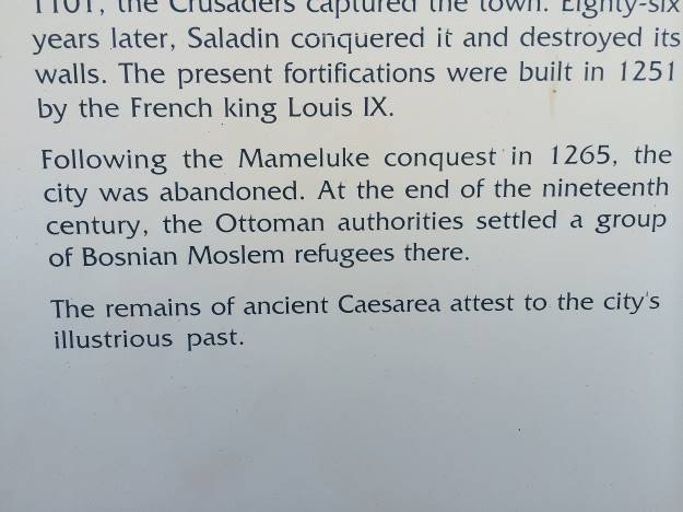 Na ulazu u Cezareju dočekuju nas srednjevjekovne zidine, ostaci utvrde koju je izgradio francuski kralj Louis IX 1252. Identičnu sliku je našla grupa Bošnjaka, bosanskih muslimana, koji su prije 140 godina izbjegli iz Bosne u najudaljeniji dio Otomanskog carstva. Naime, nakon što je Austro-Ugarska anektirala Bosnu 1878. dio izbjeglica je narednih nekoliko godina utočište potražilo na obalama Mediteranskog mora, današnjem Izraelu, nekadašnjoj pokrajini Palestini.
