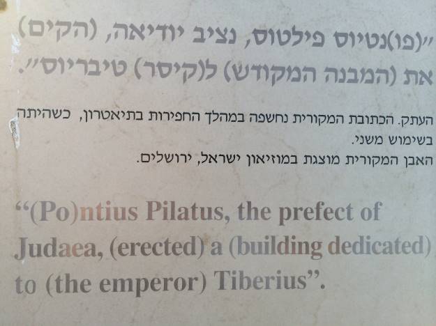 Obilazak arheoloških iskopina nas dovodi do ploče (također replika, original je u muzeju u Jeruzalemu) na kojoj je latinski tekst i gdje se jasno vidi ime Pontijusa Pilata, rimskog namjesnika u Judeji. Ovo otkriće bila je višestruka potvrda: prvo da je Cezareja bila administrativnim sjedištem rimskog carstva, drugo da je Pilat zbilja postojao i treće da se njegova vladavina odvija u periodu koji mu se i pripisuje u Bibliji. Na jednom od svojih putovanja iz Cezareje u Jeruzalem, Pontijus Pilat donosi odluku o razapinjanju Isusa Krista.