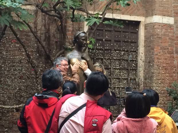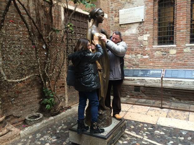 Pogled naravno leti prema jedinom balkonu na oronuloj fasadi. Za dva eura, moderne Julije odlaze na balkon i upućuju pogled prema njihovim džentlmenima u dvorištu. Žamor stotina posjetilaca se fokusira i na bronzani kip Julije. Parovi se uspinju na postolje, ruka ide ka grudima Julije i želja odlazi u kosmos.