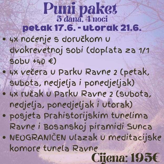 Da bi olakšali dolazak i boravak posjeticoima, u prilogu se nalaze dva turistička paketa koji uključuju smještaj (noćenje s doručkom), organske obroke tokom dana u parku ‘Ravne 2’ (ručak i večera), neograničeni broj ulaza u tunele Ravne te prisustvo svim aktinvostima tokom Festivala.