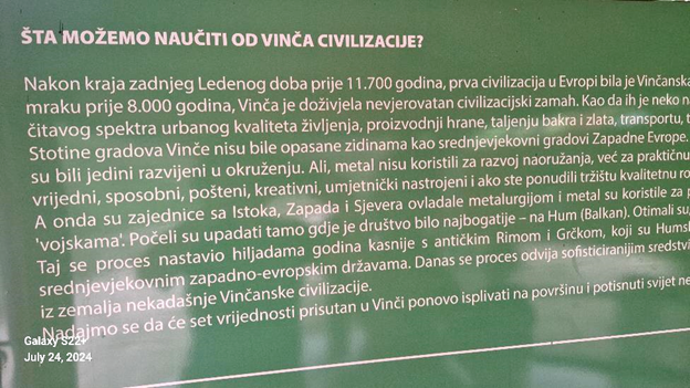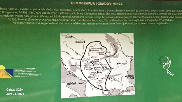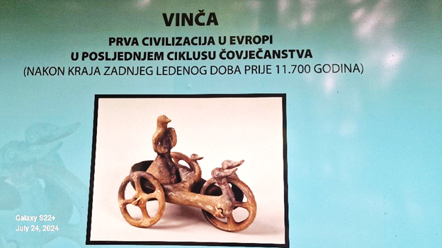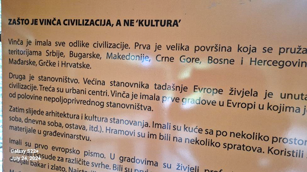 Zapadni arheološki krugovi smatraju Vinču ‘kulturom’. Međutim, u ovom paviljonu će biti argumentovano dokazano zašto je Vinča, prije 8.000 godina, bila prva evropska civilizacija. Ona ispunjava sve kriterije da bi se zvala civilizacijom: velika površina (današnje teritorije Srbije, Hrvaske, BiH, Bugarske, Crne Gore, Makedonije, Mađarske, Rumunije), polovina tadašnjeg evropskog stanovništva, prve urbane sredine u Evropi sa više od 50% nepoljoprivrednog stanovništva, arhitektonske cjeline s pravougaonim, trosobnim kućama, prva metalurgija u Evropi (talio se bakar i zlato), prva razvijena trgovina duž rjećnih korita u južnoj i istočnoj Evropi, kreativna umjetnost, prvo pismo u Evropi (ne ‘znakove’ kako to sugerišu iz Beča, Berlina i Londona).