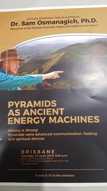 Pronalazač bosanskih piramida dr. Semir Osmanagić prezentirao je svijet piramida i otkriće Bosanske doline piramida publici u asutralijskom gradu Brisbane. Tokom trosatnog predavanja iscrpno je govorio o zabludama i nedostacima konvencionalne arheologije i historiografije u pogledu rasprostranjenosti i svrhe piramida u svijetu.