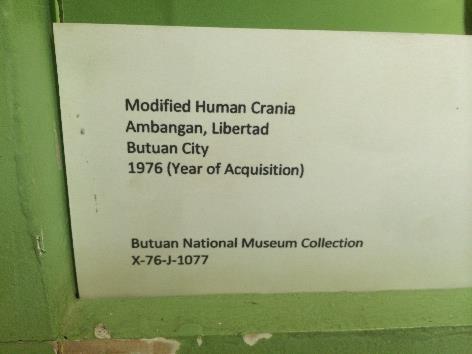 Međutim, ono što je privuklo moju pažnju su lobanje u lokalnom muzeju, National Museum Butuan Branch. Lobanje su ravne na vrhu, što odstupa od normalne autonomije. Na jednoj od lobanja, najvjerovatnije djeteta, vidljivo je da je bila pritisnuta nekim ravnim predmetom,