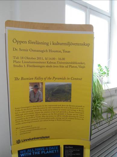 Na poziv švedske organizacije NBV, bh. klubova i radio-Sehara iz Švedske, pronalazač bosanskih piramida Semir Osmanagić gostovao je u nekoliko gradova južne Švedske i govorio o projektu istraživanja prvih evropskih piramida.