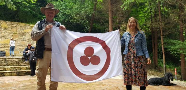 Banner of Piece has been handed from Jose Arguelles’ protégé and President of the ‘Foundation of the Law of Time’ Stephanie South to Dr. Sam Osmanagich at the end of June 2018, during ceremony in the park ‘Ravne 2’ in Visoko. She said that she was happy to bring this flag to Dr. Osmanagich as a sign of appreciation of his work for global piece and support of the leaving in the harmony with the nature.