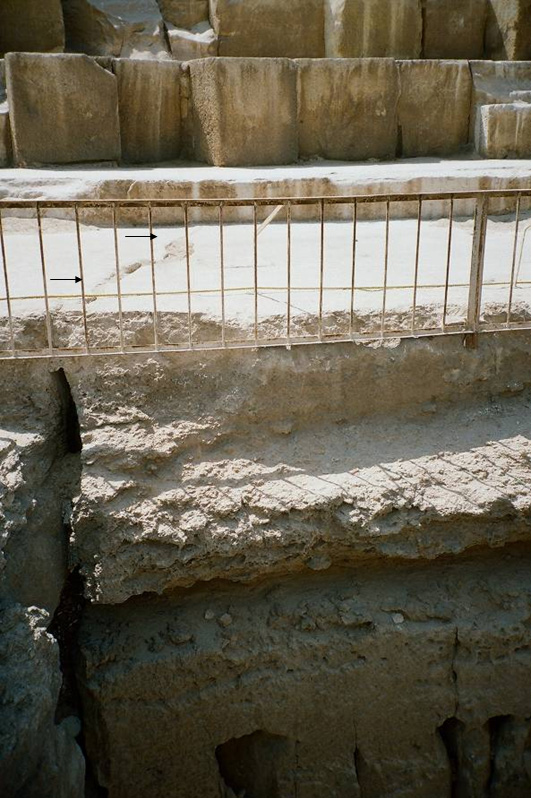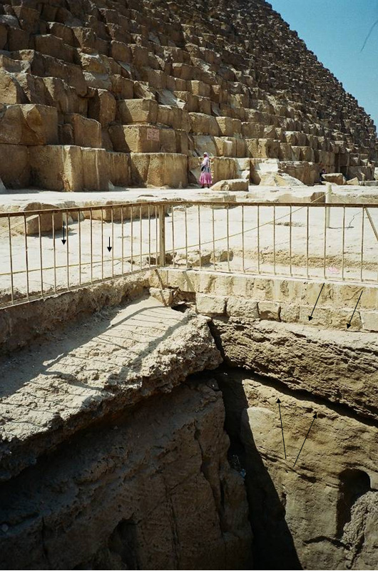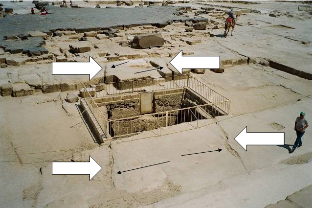 The cracks in ground level will continue to under the paved stones (the black basalt stones, east from the pyramid) and to under the first bottom blocks at the foot of the pyramid.