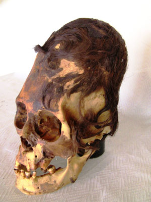 Notice the red hair on this skull (above), which also has a much heavier cranium and jaw than a human skull, as well as an elongated shape. Most skulls from the Midwest and South of the US were no oblong, but quite a few from the Southwest and West did tend to have an oblong shape. This gives rise to the question: was there more than one species of giant?