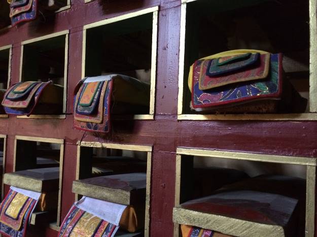 Both interior walls are the numerous shelves with the preserved scripts, manuscripts, and Buddhist documents. Finally. I wandered for a long time if certain monasteries still keep the books like this because mainly they were destroyed or taken to Beijing during the Chinese Cultural Revolution in 1967. A smaller part is taken to India, some of it is Nepal, and now I see that still, you can find them in Tibet.