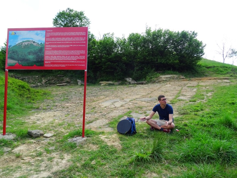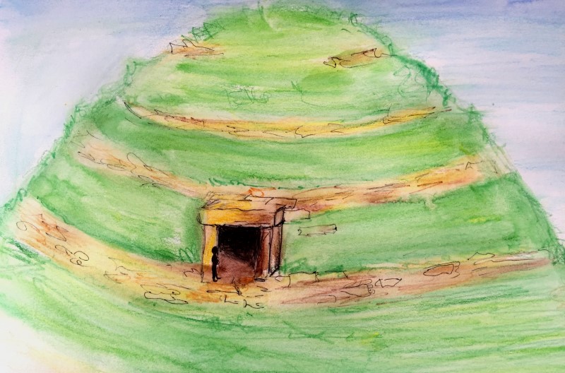 I had also seen people walk in and out the entrance. In the middle of tumulus was a charmer and some objects. As we walked around tumulus I realize that there was no open entrance now and that there was eater no way that anybody could visit the chamber inside. I have painted a picture to show my view. I meditated at the top and used my drum to connect with the energies that felt light and positive. I got visions of men who laid stones around in different terraces. The energies of the tumulus is very different from the pyramids in Visoko but still very strong.