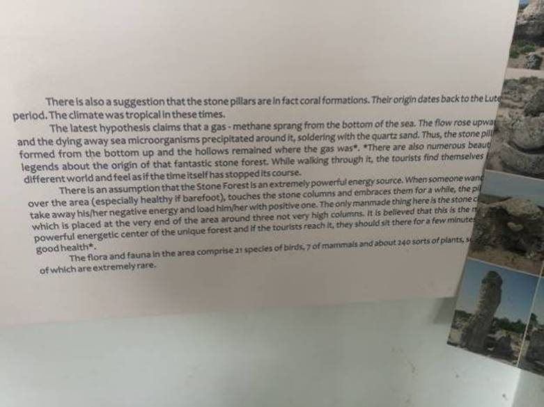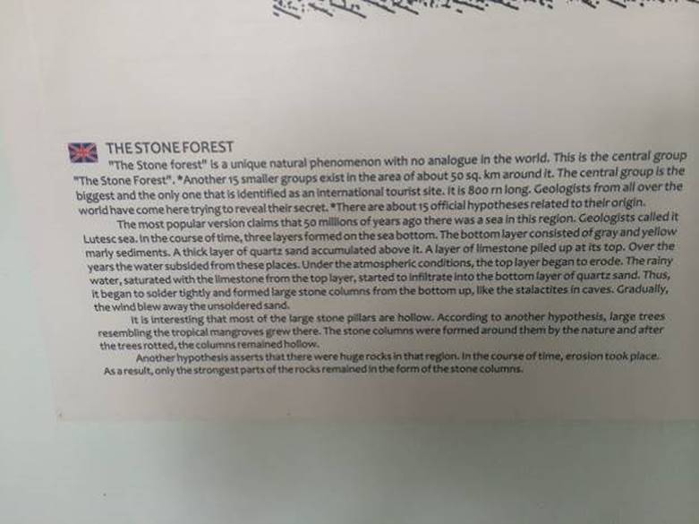 – “In the area of 50 square kilometers, you can find hundreds of vertical stones. We’ve identified fifteen groups. The first one contains 300 stone pillars in the area of 800m of length. There are a lot of theories by the geologist on the occurrence of these erected stone rocks. The first theory goes back 50 million years ago. After the Lutean Sea withdrawal, the geologist said that the space between limestones eroded forming the pillars. The other theory says that there was a forest here and that the stones formed around the trees. When the tree decomposed, the stone was on the exterior and inside was hollow. The third theory, the new one, speaks about the existence of the methane gas under the surface and sudden explosions made the rocks divide, forming of the pillars and the voids inside it.”