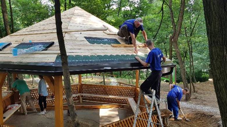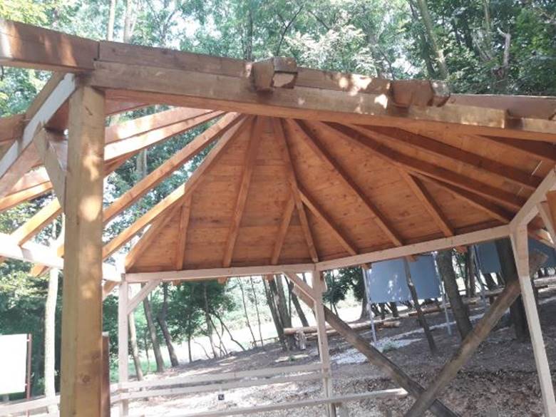 The story of the Summer House impressively reflects the efficiency of the entire Foundation. In just a few months, Foundation’s team materialized the vision of transforming the deserted and messy forest into a beautiful park with healing contents. As a crown, the construction of a hexagonal Summer House, which, combined with wooden construction and green roof shingles, was organically fitted into its environment.