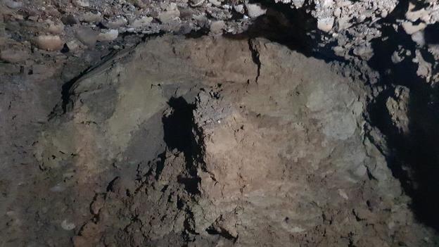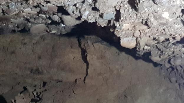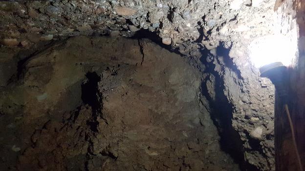 Several meters after, the structure of the filler material started to change. Instead of gravel, stone and sand, there was humid clay material discovered.