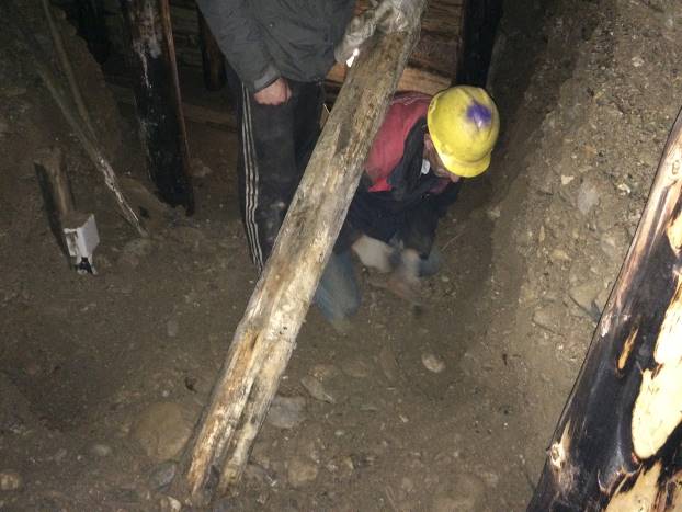 Cleaning work is done by ten Foundation’s employees lead by experienced miner One team removes the filler material (rocks, pebbles, sand), another load the wheelbarrows (everything is done manually), third team is preparing the wood to make safety wooden support afterwards.